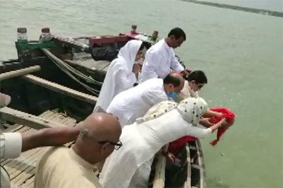 Bihar: Family of actor #SushantSinghRajput immersed his ashes in river Ganga in Patna today. He died by suicide at his residence in Mumbai's Bandra on June 14. pic.twitter.com/Heo6wrrJIQ