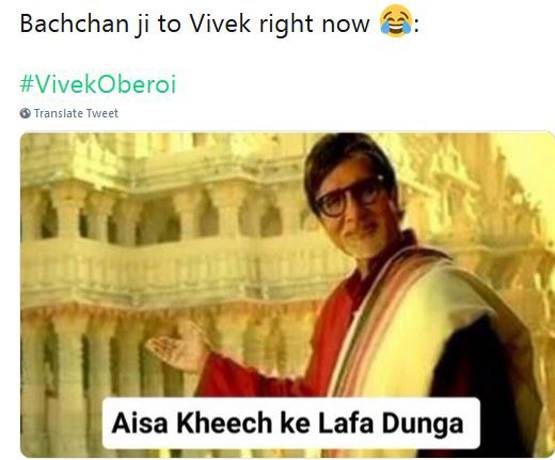 ऊपर की तस्वीर में अमिताभ बच्चन का विवेक ओबेरॉय का ट्वीट देखने के बाद रिएक्शन बताया गया है. फोटो में बिग बी हाथ उठाए खड़े हैं, कैप्शन में लिखा है- "ऐसा खींच के लाफा दूंगा."