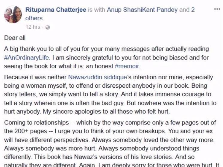 नवाज के माफी मांगने के बाद किताब की सह लेखक रितुपर्णा चटर्जी ने भी अपने फेसबुक पेज पर माफी मांगी है. उन्होंने लिखा है, ' आप सभी के संदेशों के लिए शुक्रिया. मैं आभारी हूं कि आपने बिना किसी भेदभाव के किताब पढ़ी. ये न तो मेरी इच्छा थी न ही नवाज की कि इसमें लिखी गई किसी भी लाइन से किसी की भी भावनाएं आहत हों. एक स्टोरीटेलर होने के नाते, हम सिर्फ एक कहानी कहना चाहते हैं और एक ऐसी कहानी कहने में काफी साहस की जरूरत होती है, जिसमें आपकी खुद की छवि भी बुरी साबित होती हो. लेकिन किसी को भी आहत करने की कोई इच्छा नहीं थी. मैं उन सभी से माफी चाहती हूं, जिन्हें बुरा लगा है.