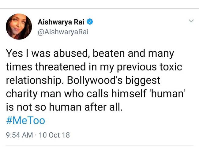 बॉलीवुड में सलमान खान, ऐश्वर्या की दोस्ती और दुश्मनी से दुनिया वाकिफ है. दोनों के बारे में बहुत कुछ कहने समझाने की जरूरत नहीं है. दोनों का रिश्ता ऐसा टूटा कि रास्ते जुदा हो गए...! देश में #MeToo कैंपेन छिड़ा है, कलाकार एक दूसरे का काला चिट्ठा खोल रहे हैं. ऐसे में ऐश्वर्या राय बच्चन के नाम से एक ट्वीट का प्रिंट स्क्रीन वायरल हो रहा है, जिसमें ऐश्वर्या की फोटो लगी है.