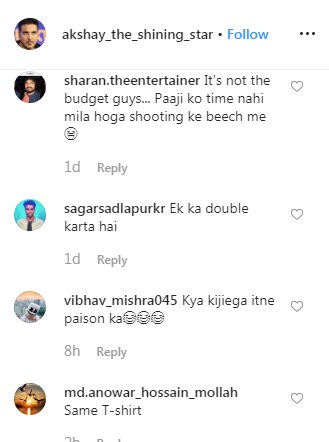 कुछ यूजर्स ने कहा कि अक्षय के पास इतने पैसे नहीं हैं क्या कि वह कपड़े बदल सके या फिर एक नया हेयर स्टाइल बना ले. यूजर ने कहा कि अक्षय अपना टाइम बचाना चाहते थे और इसलिए दोनों फिल्मों की शूटिंग के दौरान वे एक ही गेटअप में दोनों सेट पर पहुंच गए. एक यूजर ने लिखा, 'एक का डबल करता है'. वहीं एक और यूजर ने लिखा, 'जोर-जोर से चिल्लाके सबको स्कीम बता दे'.