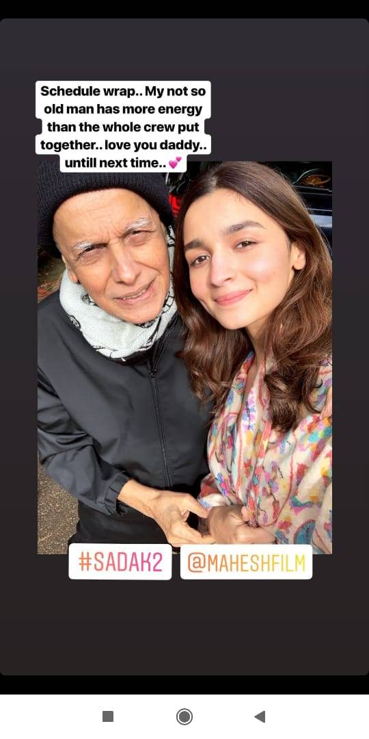 आलिया भट्ट इन दिनों अपनी अपकमिंग फिल्म सड़क 2 की शूटिंग में व्यस्त हैं. इस बीच उन्होंने ऊटी में चल रहे फिल्म के शेड्यूल रैप से एक तस्वीर साझा की है. तस्वीर में आलिया ने पापा महेश के लिए एक प्यारा सा मैसेज भी लिखा है.