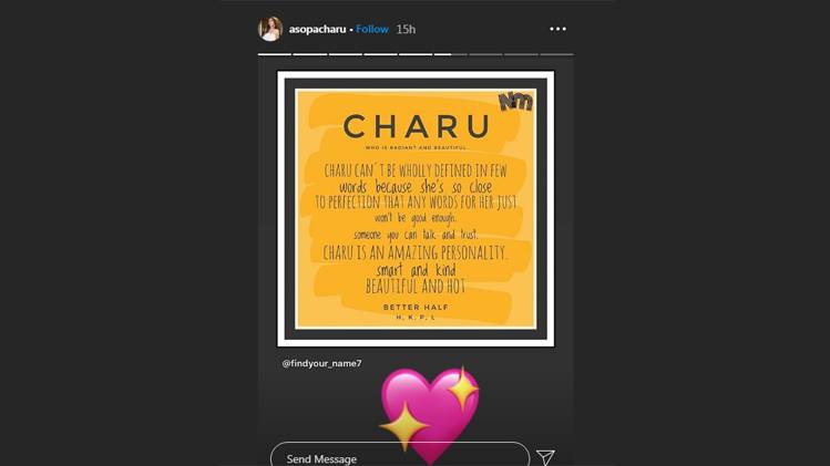चारू ने एक फोटो शेयर की है, जिसमें उनके नाम के आधार पर उनकी पर्सनालिटी के बारे में बताया गया है. इसमें लिखा है कि चारू को कुछ शब्दों में बयां नहीं किया जा सकता क्योंकि वो लगभग परफेक्ट हैं. लोग उनसे बात कर सकते हैं और उनपर भरोसा भी कर सकते हैं. चारू एक बेहतरीन पर्सनालिटी है, जो स्मार्ट है, दयालु है, सुंदर है और हॉट भी है. इसके आगे बेटर हाफ लिखा हुआ है.