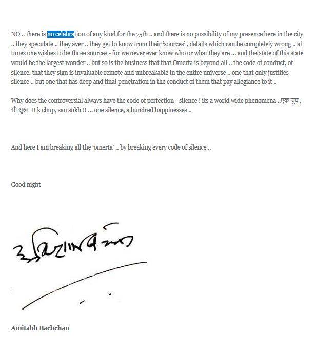 उन्होंने अपने ब्लॉग में भी करवाचौथ के बारे में लिखते हुए आखिरी पैराग्राफ में जन्मदिन सेलिब्रेट न करने की बात कही है. उन्होंने लिखा है कि 75 वें जन्मदिन के अवसर पर कोई सेलिब्रेशन नहीं होगा न ही मैं इस दिन शहर में रहूंगा. बता दें कि हिंदी सिनेमा के महानायक अमिताभ बच्चन का 11 अक्टूबर को जन्मदिन है. वह इस साल 75 वर्ष पूरे करेंगे.