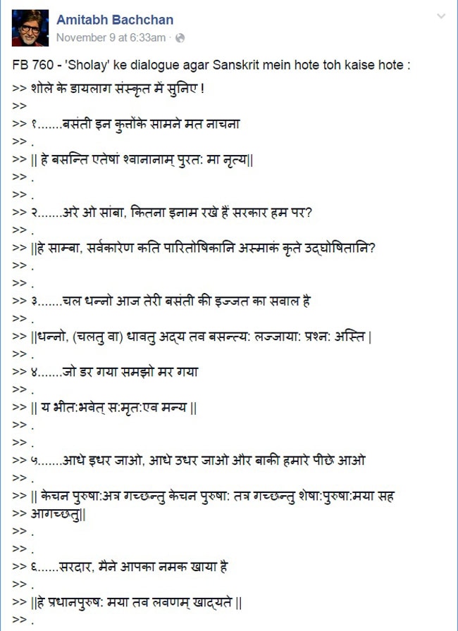 इन दिनों जर्मन बनाम संस्कृत की पढ़ाई का विवाद चल रहा है. इस पर सोशल मीडिया में व्यंग्य, कटाक्ष और चुटकुलों की बयार भी चल पड़ी है. लेकिन यह महज संयोग ही है कि मेगास्टार अमिताभ बच्चन ने 9 नवंबर को ही अपनी ब्लॉकबस्टर फिल्म 'शोले' के डायलॉग संस्कृत भाषा में शेयर किए थे. जाहिर है, इसे राजनीतिक रूप से नहीं, हास-परिहास की तरह ही देखा जाना चाहिए.