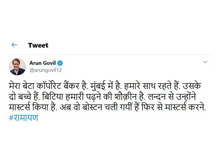 अरुण गोविल ने एक्ट्रेस श्रीलेखा गोविल से शादी की थी. इस शादी से उन्हें एक बेटा और एक बेटी है. बेटे के नाम अमल है और बेटी का नाम सोनिया गोविल है. अरुण से इंटरव्यू के दौरान पूछा गया कि उनके बच्चे क्या करते हैं. इसका जवाब देते हुए अरुण ने कहा- मेरा बेटा कॉर्पोरेट बैंकर है. मुंबई में है. हमारे साथ रहते हैं. उसके दो बच्चे हैं. बिटिया हमारी पढ़ने की शौक़ीन है. लन्दन से उन्होंने मास्टर्स किया है. अब वो बोस्टन चली गई हैं फिर से मास्टर्स करने.