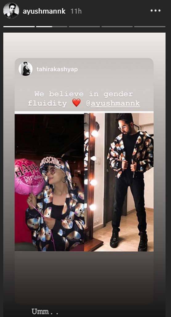 तस्वीर के कैप्शन में आयुष्मान खुराना ने लिखा, "We believe in gender fluidity." वर्क फ्रंट की बात करें तो ताहिरा कश्यप ने पिछले दिनों ये खुलासा किया है कि वह जल्द ही एक फीचर फिल्म डायरेक्ट कर सकती हैं. हालांकि साथ ही उन्होंने ये भी कहा है कि वह अपने पति आयुष्मान खुराना को कास्ट नहीं करेंगी. क्योंकि अनुभव के हिसाब से वह इंडस्ट्री में उनसे सीनियर हैं.