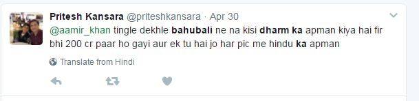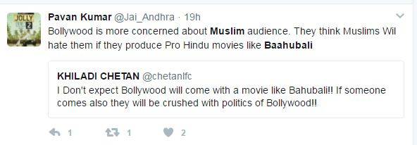 फिल्मी बीट की एक खबर के अनुसार, बाहुबली के फैन शाहरूख-सलमान-आमिर पर जमकर निशाना साध रहे हैं. कहा जा रहा है कि हिंदू धर्म का मजाक बनाए बिना भी फिल्में बन सकती हैं और ये सभी को बाहुबली से सीखना चाहिए. वहीं अक्षय कुमार की ओह माय गॉड को भी निशाने पर लेते हुए कहा जा रहा है कि भगवान के साथ चलकर भी अच्छी फिल्में बनाई जा सकती हैं.