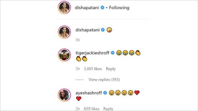 दिशा के इस वीडियो पर टाइगर श्रॉफ का तो रिएक्शन आया ही है साथ ही टाइगर की मॉम आइशा श्रॉफ का रिएक्शन भी आया है. टाइगर ने इस वीडियो पर लॉफिंग इमोजी शेयर किया है और हाथ जोड़ा है. बता दें कि इससे पहले दिशा पाटनी ने एक पोस्ट शेयर कर टाइगर श्रॉफ को बागी 2 के दो साल पूरे होने की बधाई दी थी.