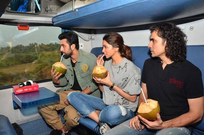 रविवार की शाम 4 बजे मुंबई के मुंबई सेंट्रल रेलवे स्टेशन से नई दिल्ली की ट्रेन में दीपिका और रणबीर कपूर सवार हुए और इनके साथ फिल्म के डायरेक्टर इम्तियाज अली भी मौजूद थे. ट्रेन में नारियल पानी का लुत्फ लेते हुए ये सितारे बरोदा और कोटा स्टेशन पर अपने फैंस का अभिवादन करते हुए आखिरकार नई दिल्ली पहुंच गए हैं और सोमवार को एक प्रेस कॉन्फ्रेंस में मीडिया से मुखातिब भी होंगे.