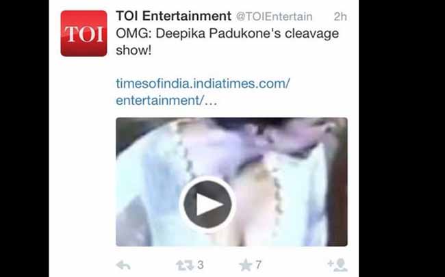 दरअसल हुआ यह कि एक प्रमुख अंग्रेजी अखबार ने दीपिका पादुकोण के बारे में एक 'वीडियो खबर' का लिंक ट्विटर पर साझा किया. इसमें लिखा था, 'ओएमजी (ओह माय गॉड), दीपिका पादुकोण का क्लीवेज शो.' दीपिका ने इस पोस्ट का स्क्रीनशॉट ले लिया और फिर जवाब देते हुए ट्विटर पर लिखा, 'हां मैं महिला हूं. मेरी ब्रेस्ट है, मेरी क्लीवेज है. आपको प्रॉब्लम?' एक और ट्वीट में उन्होंने लिखा, 'आप महिलाओं की इज्जत करना नहीं जानते तो महिला सशक्तिकरण की बात मत कीजिए.' याद रहे कि अपनी नई फिल्म के प्रचार के लिए दीपिका ने अपने ट्विटर हैंडल का नाम 'फाइंडिंग फैनी' कर रखा है.