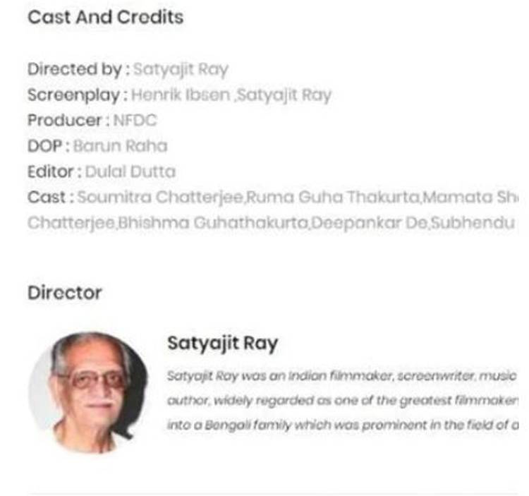 IFFI की वेबसाइट पर सत्यजीत रे की 1989 में रिलीज हुई फिल्म गनाशत्रु की डिटेल्स दी हुई थीं. इसी के साथ फिल्म के डायरेक्टर के बारे में भी बताया गया था. मगर सत्यजीत रे के नाम के बगल में गुलजार की फोटो लगा दी थी. एक यूजर ने इस गलती को नोटिस किया और इसके बाद सोशल मीडिया पर एक स्क्रीनशॉट शेयर कर इस बात की जानकारी दी. हालांकि गलती पता चलने के बाद उसे तुरंत सुधार दिया गया.