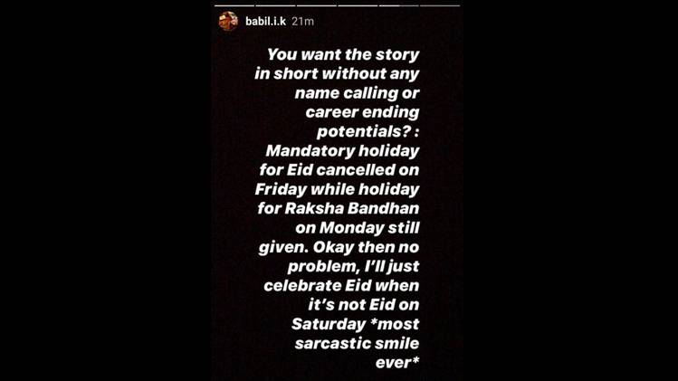 बाबिल ने अपने पर्सनल एक्सपीरियंस को ध्यान में रखते हुए लिखा- शुक्रवार को ईद की छुट्टी कैंसिल कर दी गई है जबकि सोमवार को आने वाले रक्षाबंधन की छुट्टी दी गई है. ठीक है उसमें कोई दिक्कत नहीं, मैन उस दिन ईद मना लूंगा जब ईद नहीं है यानी शनिवार को.