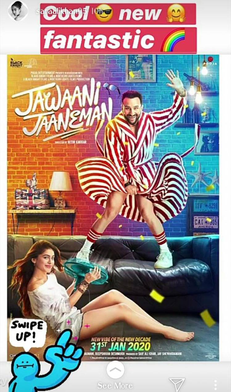 सारा अली खान ने अपने इंस्टाग्राम स्टोरी पर पिता सैफ की फिल्म जवानी जानेमन के ट्रेलर को शेयर कर लिखा, 'कूल, नया, बेहतरीन.' इससे साफ है कि सारा को अपने पापा का ये नया अवतार काफी अच्छा लगा है.