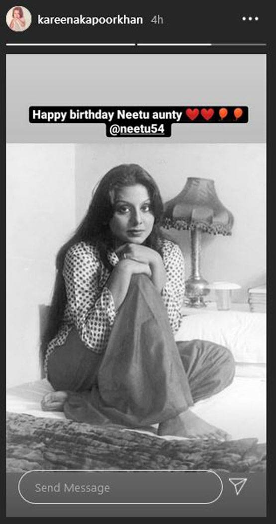 नीतू कपूर के फैन पेजों पर उनकी बेहिसाब तस्वीरें शेयर की गईं और बॉलीवुड इंडस्ट्री में भी तमाम लोगों ने सोशल मीडिया पर नीतू कपूर को विश किया. बॉलीवुड एक्ट्रेस करीना कपूर खान ने अपनी इंस्टा स्टोरी पर नीतू कपूर के जवानी के दिनों की एक तस्वीर शेयर की जिसमें वह पलंग पर बैठी नजर आ रही हैं. तस्वीर के कैप्शन में करीना ने लिखा, "हैप्पी बर्थडे नीतू आंटी."