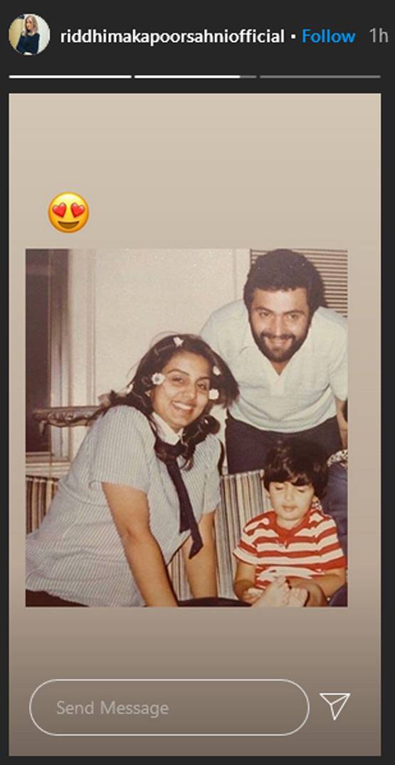 आखिरी बार अपने पिता का चेहरा भी न देख सकीं रिद्धिमा आए दिन अपने पिता को मिस करती रहती हैं. हाल ही में उन्होंने अपने पिता की एक पुरानी तस्वीर इंस्टा स्टोरी पर शेयर की है. फोटो में ऋषि कपूर और नीतू कपूर नन्हीं रिद्धिमा के पास खड़े हैं और रिद्धिमा आंखें बंद किए हुए बड़ी मासूमियत से अपनी ही धुन में लगी हुई हैं.