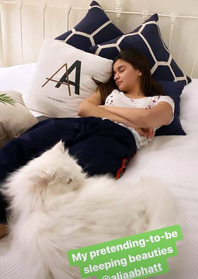 शाहीन ने इंस्टाग्राम स्टोरी में आलिया भट्ट की एक बेहद क्यूट फोटो शेयर की है. फोटो में वे बेड पर आराम से सोती नजर आ रही हैं. उनके साथ उनकी पेट कैट भी सोती दिखाई दे रही है. शाहीन ने इस खूबसूरत पल को कैप्चर किया है जिसमें आलिया प्यारी नींद लेती नजर आ रही हैं. मगर शाहीन को ऐसा लग रहा है कि आलिया और उनकी पेट कैट सो नहीं रही हैं बल्कि सोने का नाटक कर रही हैं. उन्होंने तस्वीर के साथ ये बात मेंशन की है.