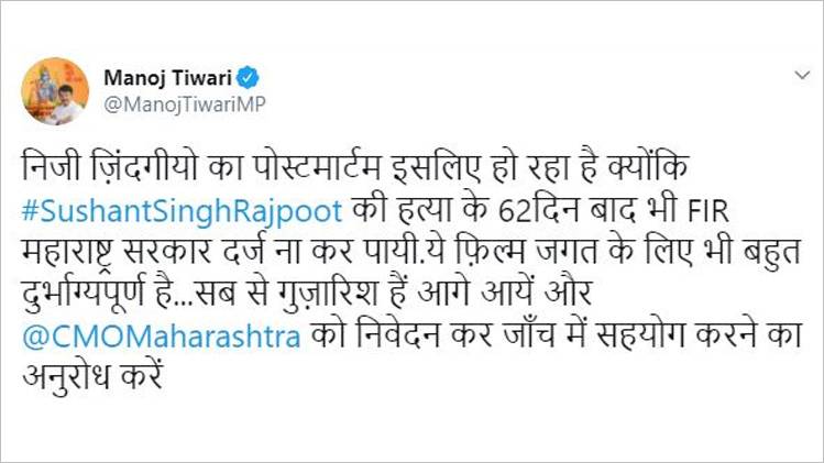 अब तक इस मामले में कई सेलेब्स सीबीआई जांच की मांग कर चुके हैं. अब भोजपुरी स्टार और बीजेपी सांसद मनोज तिवारी ने भी महाराष्ट्र के सीएम उद्धव ठाकरे सरकार से केस की जांच में सहयोग करने का निवेदन किया है. उन्होंने ट्वीट किया- 'निजी जिंदगियों का पोस्टमॉर्टम इसलिए हो रहा है क्योंकि सुशांत सिंह राजपूत की हत्या के 62 दिन बाद भी महाराष्ट्र सरकार FIR दर्ज नहीं कर पाई है. ये फिल्म जगत के लिए भी बहुत दुर्भायपूर्ण है. सब से गुजारिश है कि आगे आएं और महाराष्ट्र के सीएम को निवेदन कर जांच में सहयोग करने का अनुरोध करें'.