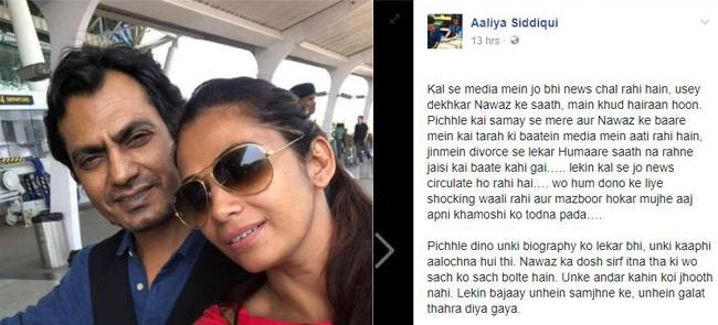 आलिया ने लिखा, कल से मीडिया में जो भी खबरें चल रही हैं उसे देखकर नवाज के साथ मैं खुद हैरान हूं. पहले भी मेरे और नवाज के बारे में कई तरह की बातें मीडिया में आती रही हैं. जिनमें तलाक से लेकर हमारे साथ न रहने जैसी कई बातें कही गईं, लेकिन कल से जो न्यूज़ फैल रही हैं वो हम दोनों के लिए हैरान करने वाली रहीं और मजबूर होकर मुझे आज अपनी खामोशी को तोड़ना पड़ा.