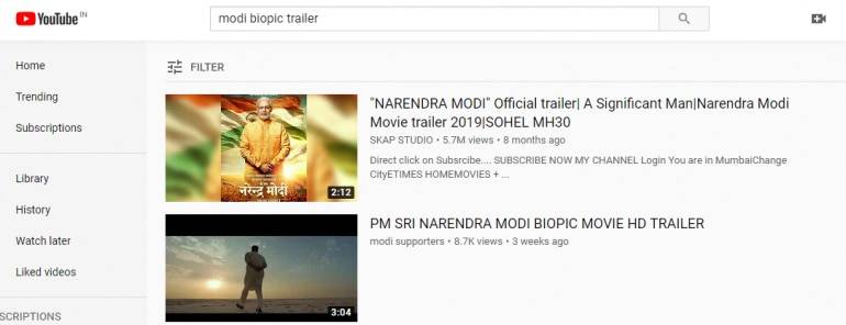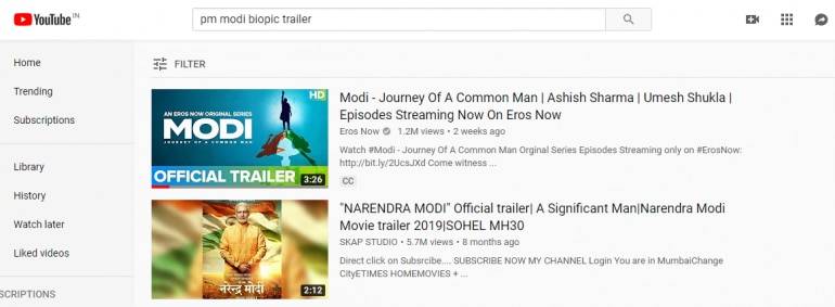 फिल्म के ट्रेलर को यूट्यूब पर सर्च करने पर बायोपिक का ट्रेलर नहीं बल्कि पीएम मोदी पर बन रही वेब सीरीज का टीजर और ट्रेलर नजर आता है. इसके अलावा यदि आप फिल्म का ट्रेलर ''pm modi biopic trailer'' कीवर्ड डाल कर सर्च करते हैं तो ''This video is unavailable'' रिजल्ट आपको यूट्यूब पर मिलेगा. इसके अलावा आप यदि वीडियो को गूगल पर ढूंढेंगे तो वहां भी यह आपको नहीं मिलेगा.