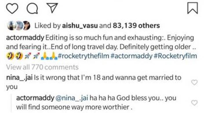 दरअसल, माधवन की एक फोटो पर फैन ने लिखा- ''क्या ये गलत है कि मैं 18 साल की हूं और आपसे शादी करना चाहती हूं.'' इसके बाद माधवन ने फैन के मासूमियम भरे सवाल का क्यूट सा जवाब दिया.