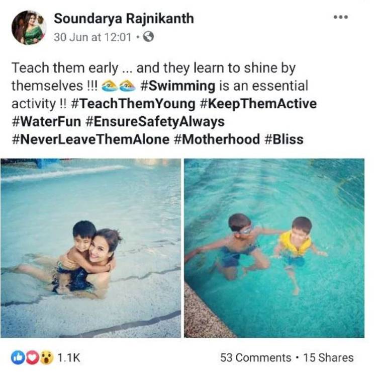 सौंदर्या रजनीकांत ने 30 जून 2019 को अपने सोशल मीडिया प्लेटफॉर्म पर दो फोटो शेयर की थीं. एक फोटो में वो अपने नन्हे बेटे वेद के साथ पूल में एन्जॉय करती दिखाई दे रही हैं, जबकि दूसरे फोटो में सौंदर्या के बेटे के साथ एक दूसरा बच्चा नजर आया. सौंदर्या ने अपनी फोटो को कैप्शन दिया, "Teach them early ... and they learn to shine by themselves !!! #Swimming is an essential activity !! #TeachThemYoung #KeepThemActive #WaterFun #EnsureSafetyAlways #NeverLeaveThemAlone #Motherhood #Bliss."