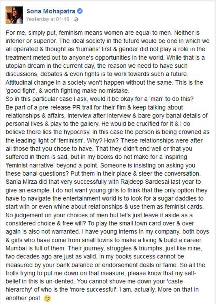वैसे इन रंगोली और सोना के बीच चल रहा ये विवाद सिर्फ इतना सा ही नहीं है. दोनों ने एक दूसरे को कई बार ट्वीट किया है. आखिर में इसके जवाब में सोना को एक लंबी फेसबुक पोस्ट लिखनी पड़ी.people like you try and milk publicity from everything please take several seats, your two minutes of fame are up. @sonamohapatra