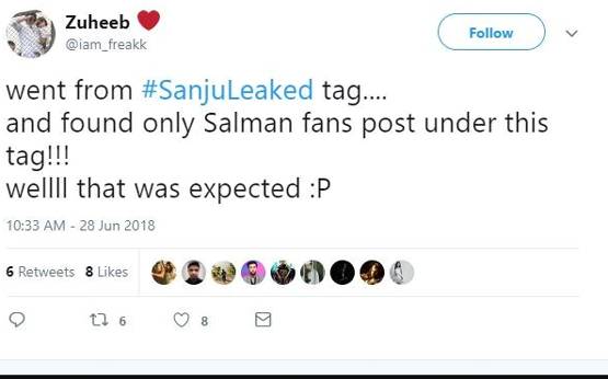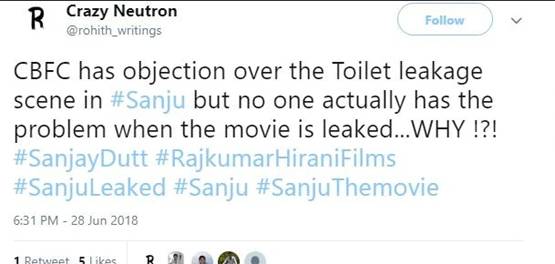 टि्वटर पर SanjuLeaked नाम से हैश टैग ट्रेंड कर रहा है. इसमें दावा किया जा रहा है कि संजू एचडी प्रिंट के साथ लीक हो चुकी है. इसके बाद संजू के कुछ प्रशंसक सक्रिय हुए और उन्होंने पायरेटेड कॉपी न देखकर थिएटर में जाने को कहा. साथ ही Torrent लिंक को शेयर न करने को भी कहा गया. एक यूजर ने लिखा है, "सेंसर बोर्ड को संजू में टॉयलेट वाले सीन पर आपत्ति है, लेकिन पूरी फिल्म लीक होने पर नहीं. ऐसा क्यों?"