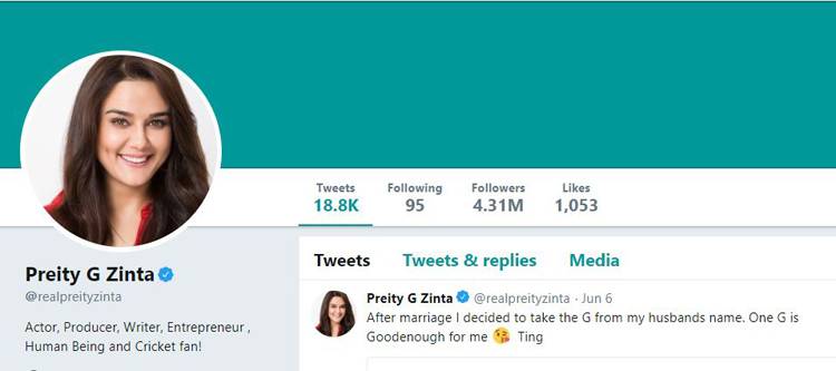 सोशल मीडिया पर जानकारी देते हुए प्रीति जिंटा ने अपने नए नाम की घोषणा की. उन्होंने लिखा, After marriage I decided to take the G from my husbands name. One G is Goodenough for me 😘 Ting