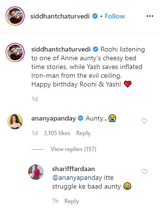 सिद्धांत द्वारा अनन्या को आंटी कहने पर ट्रोलर्स ने भी अनन्या को आंटी कह कर ट्रोल करना शुरू कर दिया. दरअसल, सिद्धांत ने फोटो में लिखा- 'रुही ऐनी आंटी की बेड टाइम स्टोरीज को सुनते हुए, यश ने तो अपने आयरन-मैन को इससे बचा लिया. हैप्पी बर्थडे रूही और यश.' खुद अनन्या ने भी इस कैप्शन पर रोने वाली इमोजी शेयर की.