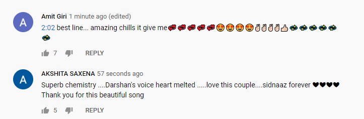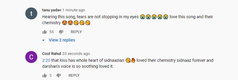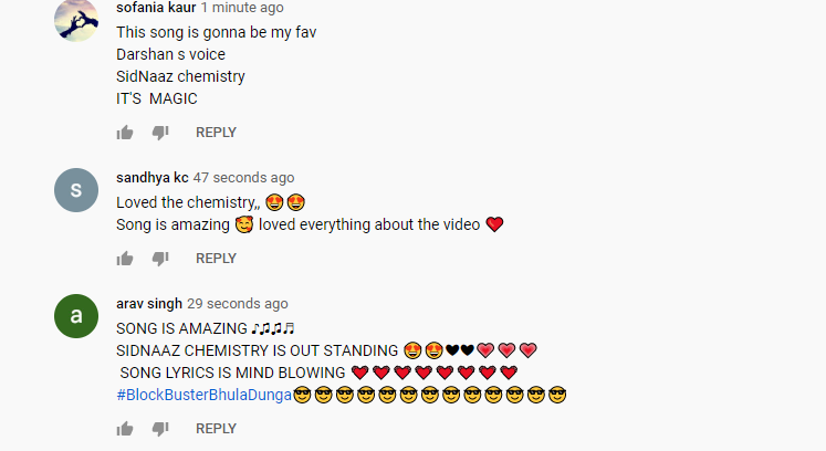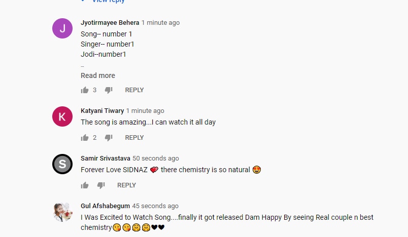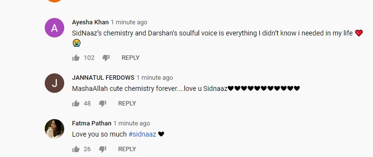लोगों को लंबे समय से इस गाने का इंतजार था. ये गाना लोगों को काफी पसंद आ रहा है. सिद्धार्थ और शहनाज की केमिस्ट्री की तारीफ करते लोग थक नहीं रहे. वहीं दर्शन रावल की आवाज की भी तारीफ हो रही है. दिल चुरा लिया, अमेजिंग केमिस्ट्री, सिडनाज की नैचुरल केमिस्ट्री, शानदार, जैसे कमेंट गाने को मिल रहे हैं.
