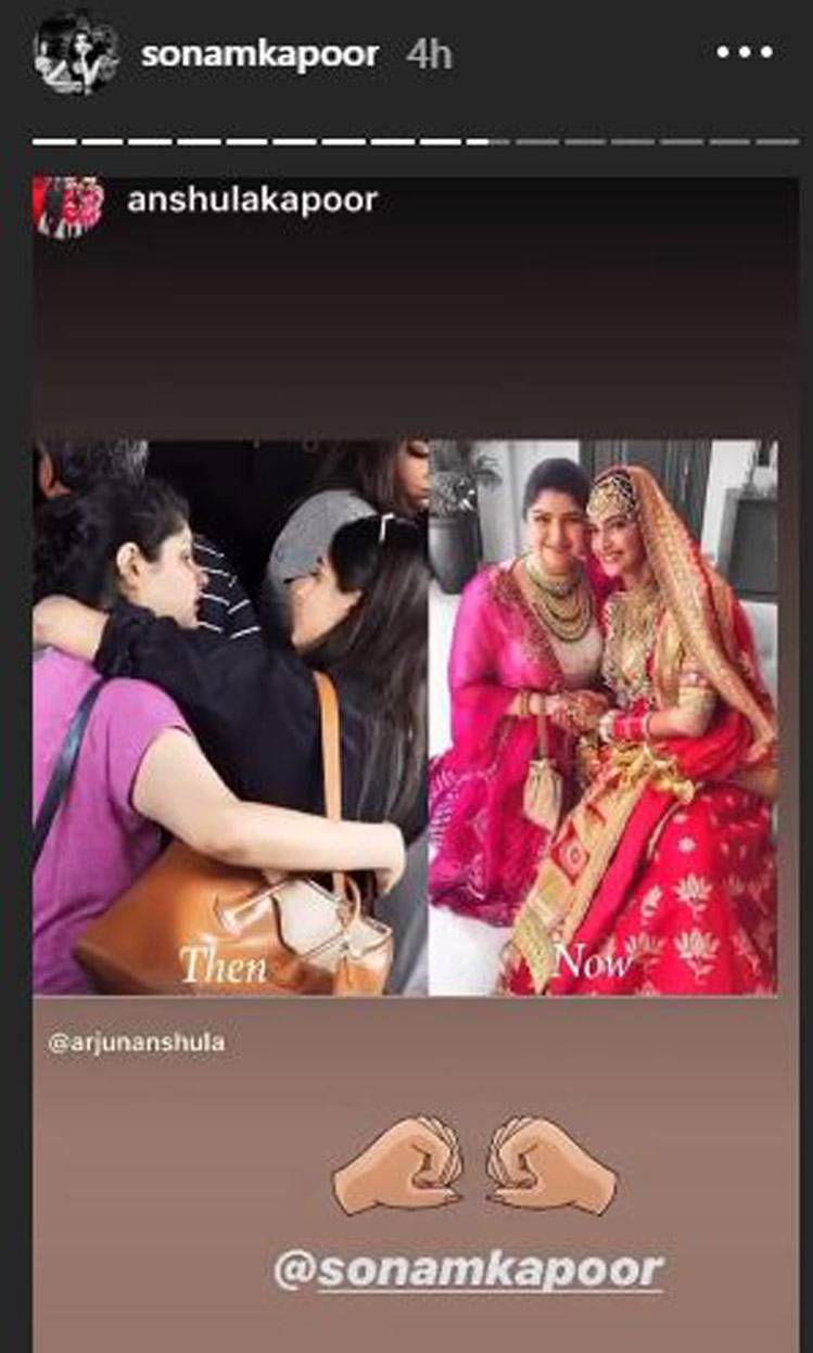 अंशुला की इस फोटो को सोनम कपूर ने अपनी इंस्टा स्टोरी पर शेयर किया है. पुरानी फोटो में सोनम और अंशुला बात करते दिखाई दे रहे हैं वहीं दूसरी फोटो में सोनम और अंशुला स्माइल कर रहे हैं. बता दें कि दूसरी फोटो सोनम कपूर की शादी की है. फोटो में सोनम तो खूबसूरत लग ही रही हैं लेकिन अंशुला भी काफी जंच रही हैं.