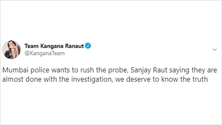सुशांत मामले में लगातार बड़े दावे और खुलासे कर रहीं कंगना रनौत ने एक बार फिर सोशल मीडिया पर मुंबई पुलिस की जांच पर सवाल खड़े किए हैं. उन्होंने शिवसेना के सासंद संजय राउत पर भी निशाना साधा है. ट्वीट कर कंगना की टीम की तरफ से लिखा गया है- इस मामले में मुंबई पुलिस जल्दबाजी दिखा रही है, संजय राउत कह रहे हैं कि मामले की जांच खत्म होने वाली है, सच सामने आना चाहिए. कंगना ने एक छोटे वीडियो के जरिए भी सुशांत मामले में सीबीआई जांच की पैरवी की है.