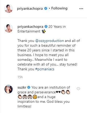 प्रियंका चोपड़ा ने मनोरंजन जगत में अपने 20 साल पूरे कर लिए हैं. इस खास मौके पर एक्ट्रेस ने एक वीडियो शेयर किया था. उनके इस पोस्ट पर सेलिब्रिटीज ने उन्हें बधाई दी. वहीं ऋतिक रोशन की एक्स-वाइफ सुजैन खान ने भी प्रियंका की तारीफ की है. सुजैन ने प्रियंका को अपनी प्रेरणा बताया और एक संस्थान का दर्जा दिया.