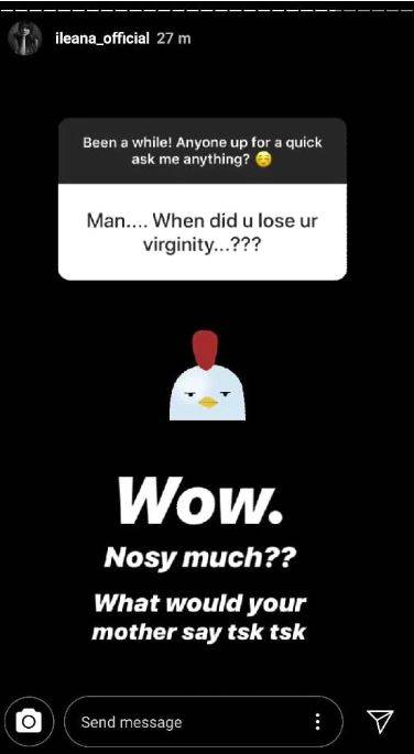 इंस्टाग्राम पर सेशन के दौरान यूजर ने इलियाना से पूछा, 'आपने वर्जिनिटी कब खोई थी? सवाल पर इलियाना ने जवाब दिया, ''तुम्हारी मां क्या कहेंगी.'' एक्ट्रेस ने इंस्टा स्टोरी पर सवाल जवाब के सेशन की एक फोटो भी शेयर की है.