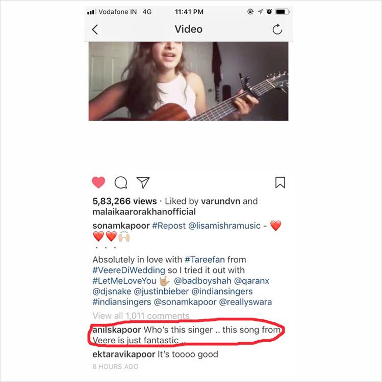 सोनम कपूर द्वारा शेयर किए गए इस वीडियो की पापा अनिल कपूर से लेकर एकता कपूर तक इंडस्ट्री के कई सिलेब्स तारीफें करते नहीं थक रहे. यहां तक अनिल कपूर ने कमेंट बॉक्स में ये तक पूछा है कि ये सिंगर कौन है?