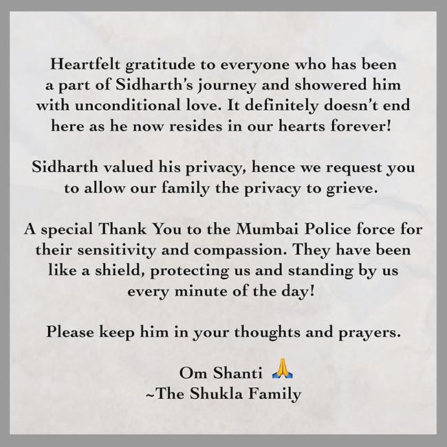 स्टेटमेंट में लिखा गया- जो भी सिद्धार्थ की जर्नी का हिस्सा रहे और बहुत प्यार जताया, उनका हार्दिक आभार. ये निश्चित तौर पर अंत नहीं है, सिद्धार्थ हमेशा हम सभी के दिल में रहेंगे. सिद्धार्थ अपनी प्राइवेसी की वैल्यू करते थे. इस लिए हम सभी से रिक्वेस्ट करते हैं कि हमारी फैमिली को प्राइवेसी दें. मुंबई पुलिस फोर्स को उनकी संवेदनशीलता के लिए खास तौर पर थैंक्यू. वो शील्ड की तरह रहे, हमें प्रोटेक्ट किया और हर मिनट हमारे साथ खड़े रहे. प्लीज सिद्धार्थ को अपनी यादों और प्राथर्नाओं में रखिए. ओम शांति. शुक्ला फैमिली.