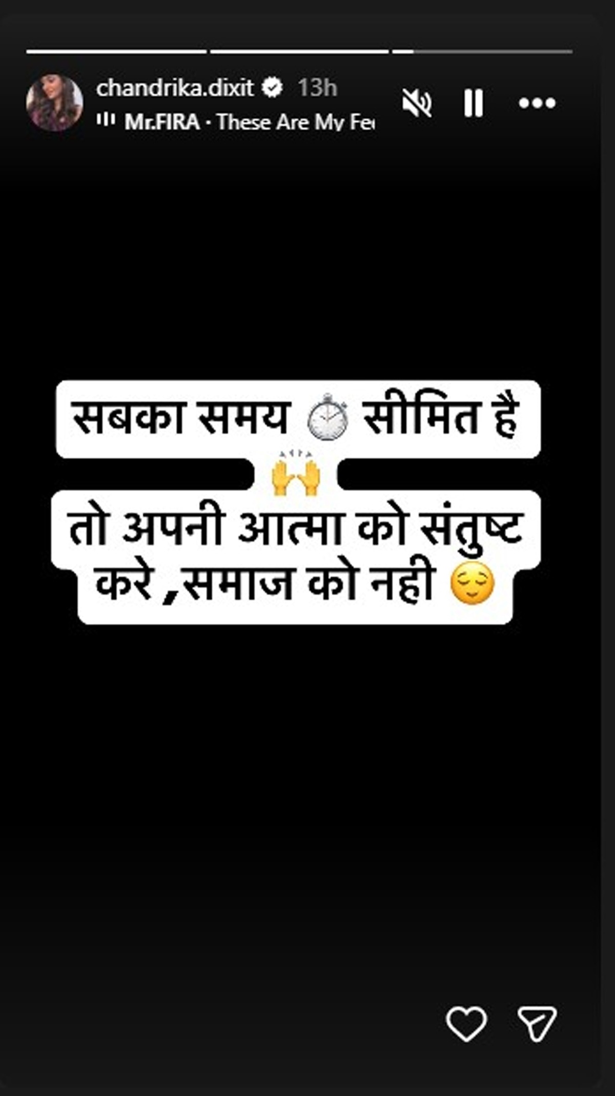 चंद्रिका ने दूसरी स्टोरी में लिखा- सबका समय सीमित है. अपनी आत्मा का संतुष्ट करें...समाज को नहीं. चंद्रिका की ये पोस्ट देखने के बाद लोगों को लग रहा है कि उन्होंने मिस्ट्री मैन संग अपने रिश्ते की तरफ इशारा किया है.
