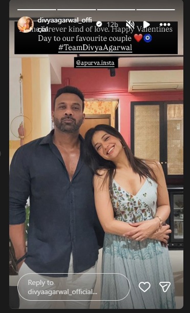 दिव्या अग्रवाल की टीम ने भी उनकी इंस्टाग्राम स्टोरी पर कपल की एक रोमांटिक फोटो पोस्ट की. पोस्ट के कैप्शन में कपल के लिए दिल को छूने का वाला कैप्शन लिखा गया, जो है- हमेशा रहने वाला प्यार...हमारे फेवरेट कपल को हैप्पी वैलेंटाइन्स डे.