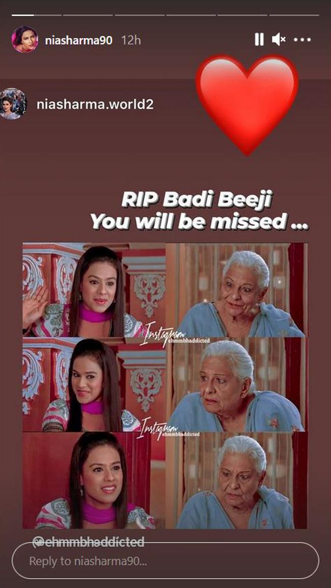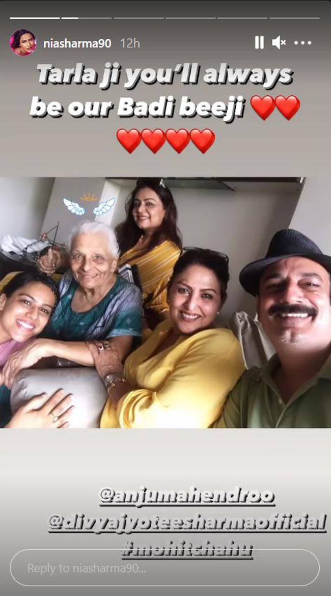 निया ने तरला जोशी के साथ फोटोज शेयर करते हुए लिखा- RIP बड़ी बीजी, आप बहुत याद आएंगी. दूसरे फोटो के साथ उन्होंने हार्ट इमोजी बनाए हैं. एक फोटोज के कैप्शन में निया ने लिखा- तरला जी आप हमेशा हमारी बड़ी बीजी रहेंगी. फोटोज में एक्टर अंजू महेंद्रू और दिव्यज्योति शर्मा भी नजर आ रहे हैं. तस्वीर में तरला जोशी संग निया की क्यूट बॉन्डिंग देखी जा सकती है.