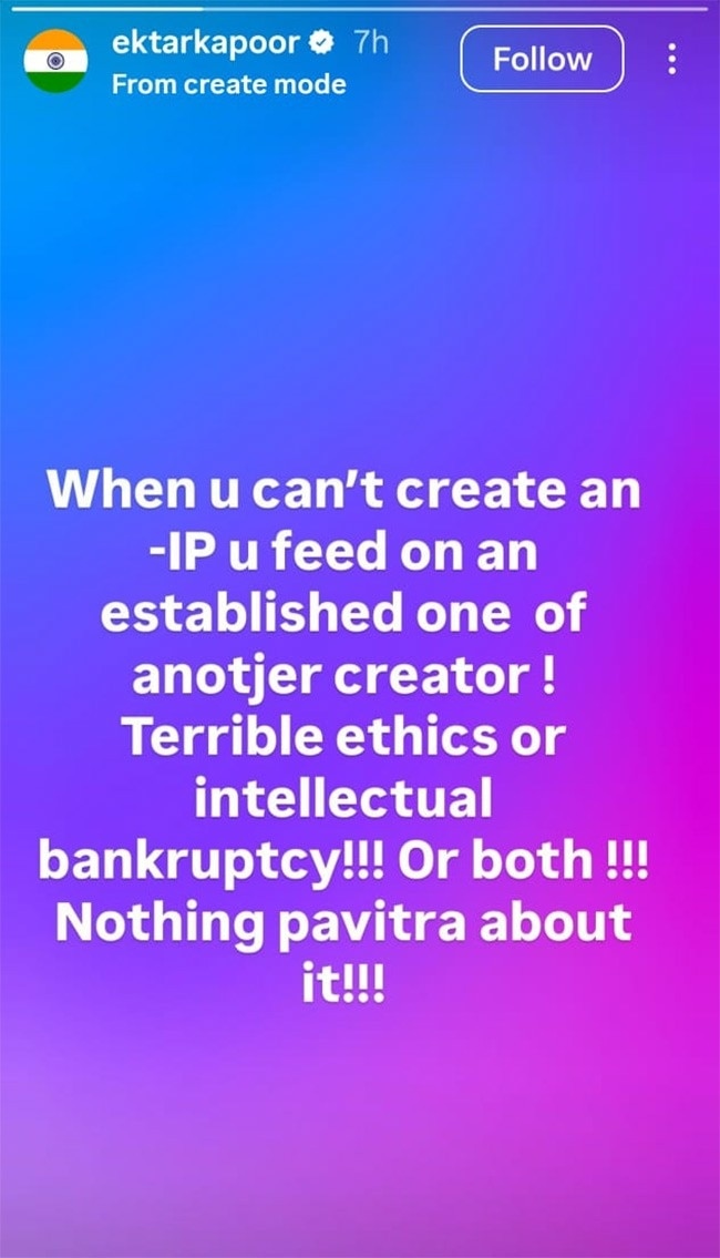 अपने इंस्टाग्राम स्टोरीज पर एकता ने इस फैसले की कड़ी आलोचना की और क्रिएटर्स पर पहले से मौजूद इंटेलेक्चुअल प्रॉपर्टी का फायदा उठाने का आरोप लगाया.एकता कपूर ने लिखा, 'जब क्रिएटर्स अपना खुद का IP नहीं बना पाते हैं, तो वे किसी और के काम पर निर्भर हो जाते हैं. ये 'भयानक एथिक्स' और 'इंटेलेक्चुअल दिवालियापन' का मामला है.' उन्होंने अंत में लिखा, 'इस फैसले में 'कुछ भी पवित्र नहीं' है.