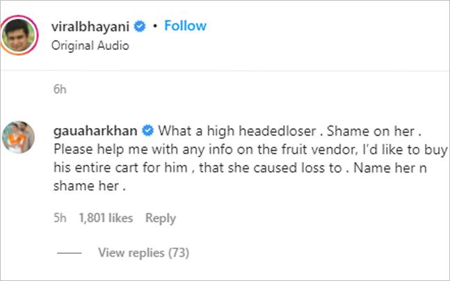 वायरल वीडियो के नीचे गौहर ने नाराजगी जाहिर करते हुए लिखा 'इतने गर्म-दिमाग वाली लूजर, शर्म है तुम पर. प्लीज उस फ्रूट वेंडर की जानकारी दें, मैं सारे फल खरीदना चाहूंगी, जो उस महिला ने उस फल विक्रेता का नुकसान किया है. नाम बताओ और शर्मिंदा करो.' गौहर की इस नाराजगी पर कई यूजर्स ने सहमती जताई है. लोगों ने भी महिला की ओलाचना करते हुए गौहर की हां में हां मिलाई है.