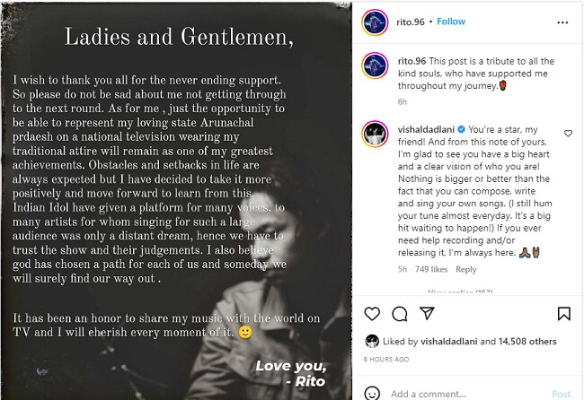 बड़ी बात ये रही कि रीतो के इस पोस्ट पर खुद विशाल डडलानी ने भी कमेंट किया है. विशाल ने लिखा- 'तुम एक स्टार हो, मेरे दोस्त. और तुम्हारे इस नोट को देखकर मैं कह सकता हूं कि तुम्हारा दिल बहुत बड़ा है. इससे बड़ा फैक्ट और कुछ नहीं कि तुम लिख सकते हो, कम्पोज कर सकते हो और गा सकते हो खुद अपने ही लिखे गाने को. मैं आज भी तुम्हारे ट्यून्स को गुनगुनाता रहता हूं. ये बहुत हिट है, जो बस वक्त के इंतजार में है. अगर तुम्हे कभी भी हेल्प चाहिए इसे रिकॉर्ड करने या रिलीज करने में तो मैं हूं यहां.'