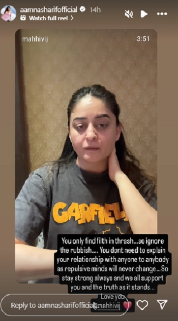 आमना ने अपनी इंस्टाग्राम स्टोरी पर ट्रोल्स को जवाब देते हुए एक नोट शेयर किया. आमना की पोस्ट में लिखा था- गंदगी आपको कूड़े में ही मिलेगी. इसलिए बेकार बातों को नजरअंदाज करो. तुम्हें अपने रिश्ते को लेकर किसी को कोई सफाई देने की जरूरत नहीं है, क्योंकि घटिया सोच वाले लोग कभी नहीं बदलते. हमेशा मजबूत रहो, हम सब तुम्हारे साथ हैं और सच तुम्हारे साथ है. लव यू.