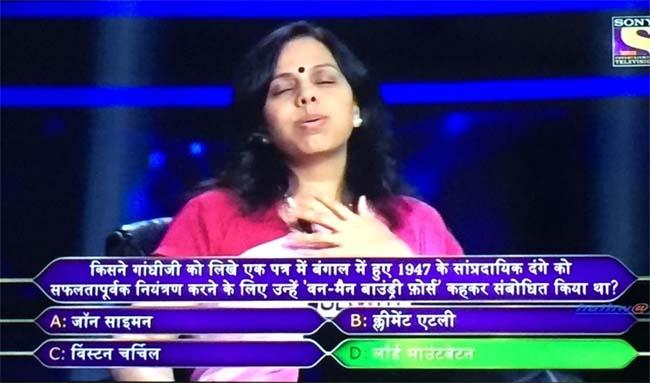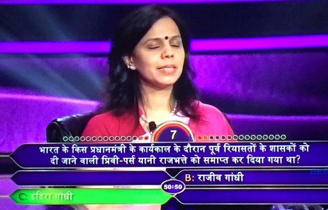 सही जवाब- इंदिरा गांधी [50ः50 लाइफलाइन लेकर छवि ने इस सवाल का सही जवाब दिया]