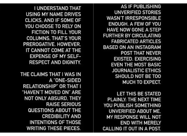 एक्टर ने आगे लिखा,'ये कहना कि मैं एकतरफा रिश्ते में था या कि मैं मूव-ऑन नहीं कर पाया, ये बातें बिल्कुल बेकार और झूठी हैं. ये उन लोगों की नीयत और विश्वसनीयता पर सवाल उठाती हैं जो ऐसी बातें लिखते हैं. कुछ लोग तो उस इंस्टाग्राम पोस्ट पर भी लेख लिख रहे हैं जो कभी मौजूद ही नहीं थी. कम से कम बुनियादी पत्रकारिता करना कोई मुश्किल काम नहीं है.'