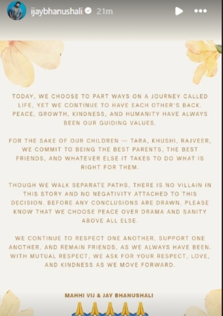 'हालांकि अब हमारा रास्ता अलग है, लेकिन इस फैसले में कोई खलनायक नहीं है. ये कहानी नकारात्मकता या किसी गलत के बारे में नहीं है. कृपया समझें कि हम ये कदम शांति, सुकून और अपने मानसिक स्वास्थ्य के लिए उठा रहे हैं- किसी और वजह से नहीं. हम एक-दूसरे का सम्मान करते रहेंगे, एक-दूसरे का साथ देंगे और एक-दूसरे के लिए दुआ करते रहेंगे. हम आपसे भी यही निवेदन करते हैं कि हमारे इस फैसले का सम्मान करें, हमें प्यार और समझ दें, और हमारी निजता का ख्याल रखें, ताकि हम आगे बढ़ सकें- माही और जय भानुशाली.'