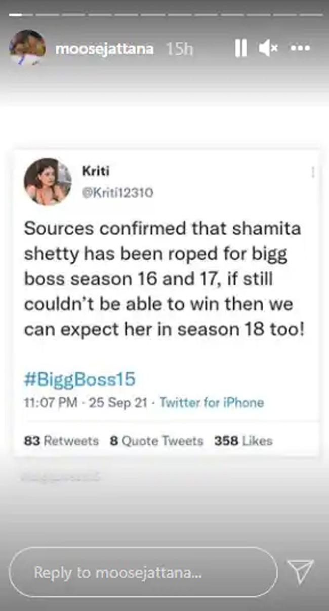 मूस जट्टाना ने अपनी इंस्टाग्राम स्टोरी पर एक ट्वीट का स्क्रीनशॉट शेयर किया, जिसमें शमिता शेट्टी की बिग बॉस 15 में एंट्री पर तंज किया गया था. ट्वीट में लिखा था- "सूत्रों ने कंफर्म किया है कि शमिता शेट्टी को बिग बॉस सीजन 16 और 17 के लिए भी चुना गया है. लेकिन अगर फिर भी वो जीत नहीं पाईं तो हम उन्हें सीजन 18 में भी देखने की उम्मीद कर सकते हैं."