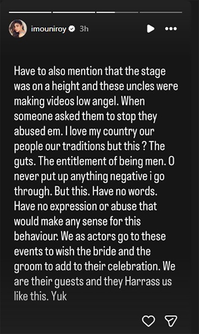 मौनी ने आगे कहा कि वो उनके साथ हुए इस इंसीडेंट के बाद से ट्रॉमा में हैं. एक्ट्रेस बोलीं- वो इसके बाद भी नहीं रुके और न ही किसी परिवार के सदस्य या ऑर्गेनाइजर ने उन्हें वहां से हटाया. अगर मेरे जैसे इंसान को इन सब चीजों को सामना करना पड़ रहा है, तो मैं सोच भी नहीं सकती कि उन नई लड़कियों का क्या हाल होता होगा, जो अभी काम करना और शो करना शुरू कर रही हैं.