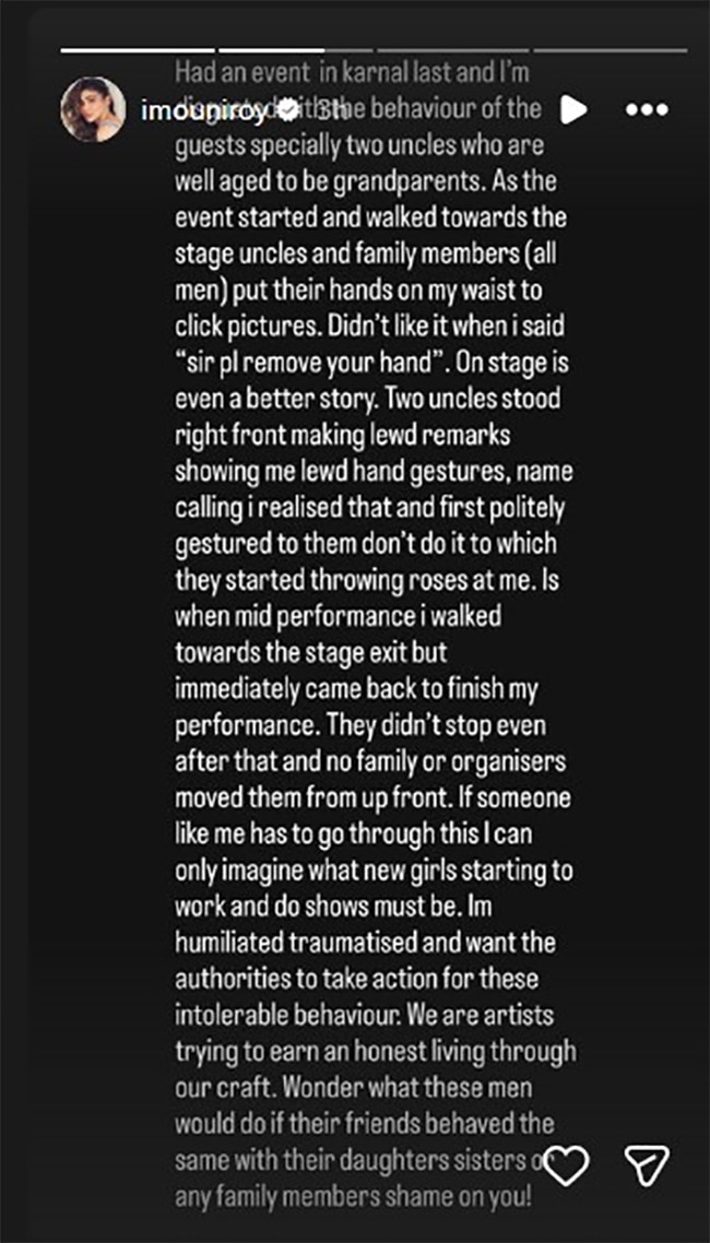 मौनी ने कहा कि इवेंट में बुजुर्ग शख्स ने फोटो लेने के बहाने उन्हें गलत तरीके से छूने की कोशिश की. मौनी ने पोस्ट में लिखा- मेरा पिछला इवेंट करनाल में था और मैं वहां के मेहमानों के बर्ताव से काफी दुखी हूं. खासकर दो बुजुर्गों से जिनकी उम्र दादा-नाना के बराबर थी. जैसे ही इवेंट शुरू हुआ और मैं स्टेज की तरफ गई तो वहां मौजूद बुजुर्ग और कुछ परिवार के लोगों ने फोटो खिंचवाने के लिए मेरी कमर पर हाथ रखा. जब मैंने उनसे कहा कि 'सर, अपना हाथ हटाइए', तो उन्हें यह अच्छा नहीं लगा.